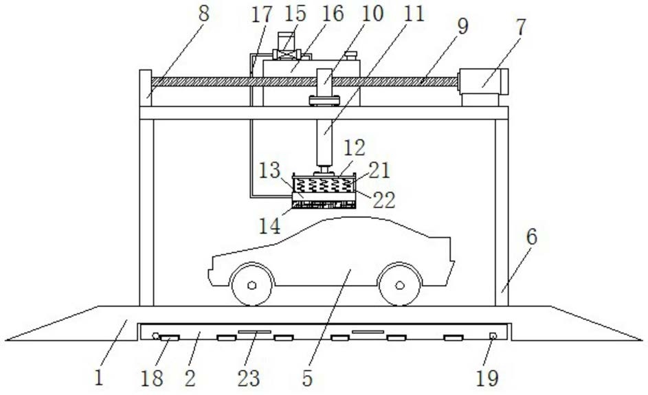 5.根据权利要求1所述的一种新能源汽车用清洗装置,其特征在于,所述支撑架(6)的顶面开设有让位槽,且支撑架(6)顶面的让位槽位于丝杆(9)的正下方,所述支撑架(6)中部的一侧开设有让位孔,所述支撑架(6)中部的让位孔内部活动套接有长软管(17)的一端。