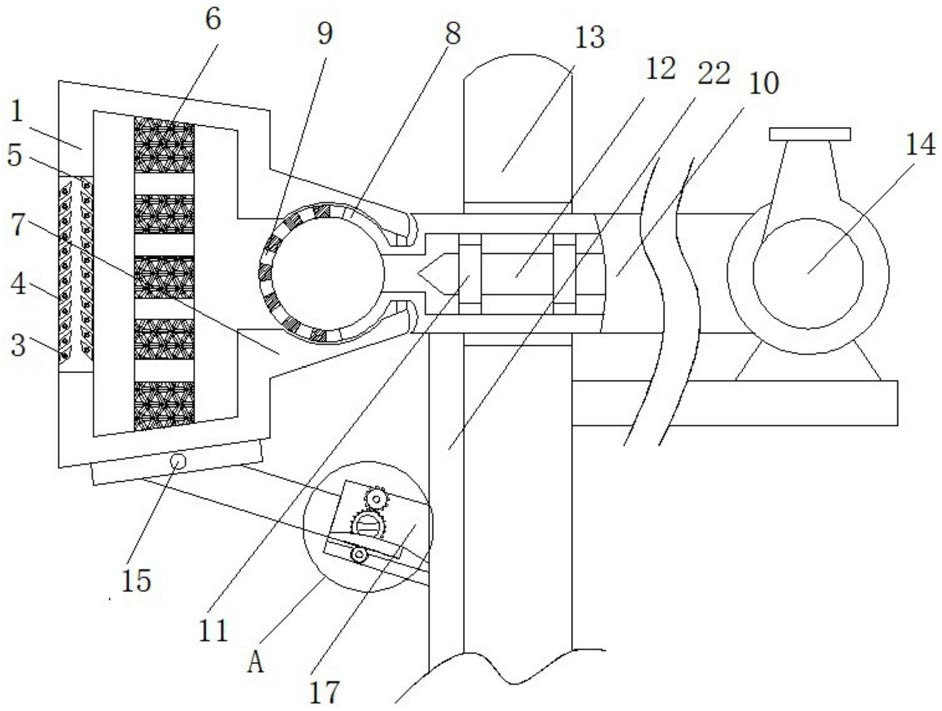6.根据权利要求1所述的一种家居生活厨房用油烟机,其特征在于:所述吸尘装置一(6)和支架(22)的表面固定连接有空气吸尘装置,可将空气中的烟尘进行吸收,同时吸尘装置一(6)的表面开设有孔,吸尘装置一(6)固定连接有活动外套二(12),所述活动外套二(12)固定连接有连接通道(10)的中部,并在连接通道(10)内部设有悬空状,且在连接通道(10)的另一侧固定连接有吸尘装置二(14),同时吸尘装置二(14)可将装置内部空气进行吸收。