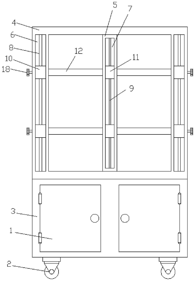 1.一种汽车零配件销售展示架,包括柜体(1),其特征在于:所述柜体(1)底端对称固定设有若干万向轮(2),所述柜体(1)的前侧对称铰接有若干门体(3),所述柜体(1)顶端固定设有展示台(4),所述展示台(4)的中间位置处固定设有竖板(5),所述竖板(5)位于所述展示台(4)的凹槽部,所述展示台(4)的两侧竖直部均开设有滑槽一(6),所述竖板(5)内开设有滑槽二(7),所述滑槽一(6)内均固定设有滑板(8),所述滑槽二(7)内的前侧和后侧均对称固定设有滑杆(9),所述滑板(8)上均滑动设有若干滑块一(10),所述滑块一(10)与所述滑槽一(6)滑动连接,所述滑杆(9)上滑动设有若干滑块二(11),所述滑块二(11)与所述滑槽二(7)滑动连接,所述滑块二(11)与相邻的所述滑块一(10)之间均固定设有放置台(12),所述滑块一(10)远离所述滑块二(11)的一侧均对称设有若干通槽(13),所述通槽(13)的两侧均设有滑槽三(14),所述通槽(13)内均滑动设有限位杆(15),所述滑槽三(14)内均滑动设有滑块三(16)。