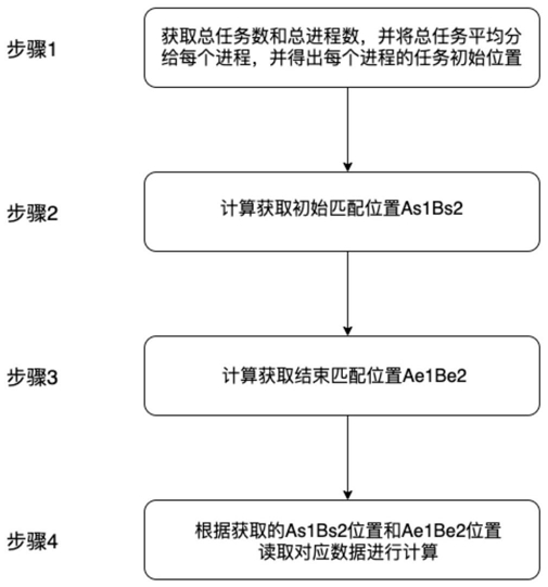 步骤102,将总进程个数定义为np,目标是求总任务平均分配给每个进程后,每个进程的任务初始匹配位置As1Bs2和结束匹配位置Ae1Be2;