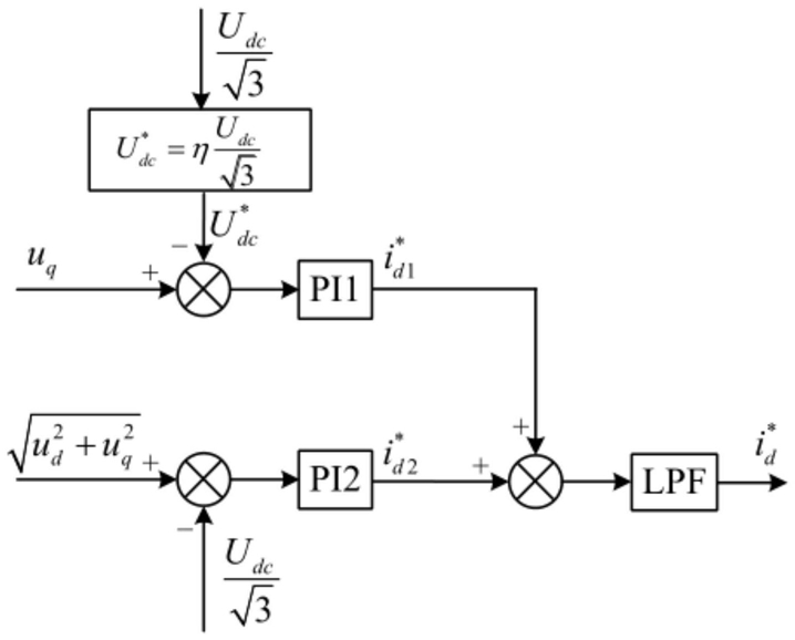 步骤3、基于步骤2的调节因子η求取虚拟直流母线指令电压步骤4、基于步骤3的虚拟直流母线指令电压 预调节q轴电压分量uq,输出励磁电流分量。