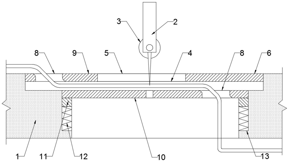 3.根据权利要求1或2所述的缝纫机夹板自动缝纫装置,其特征在于,所述静压板(6)包括上压板(9)和下托板(10),上压板(9)设置在缝纫机工作台(1)的镶嵌槽内,上压板(9)表面与缝纫机工作台(1)表面平齐,所述下托板(10)设置在上压板(9)的下方。