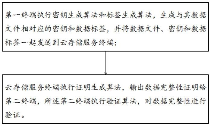 云存储服务终端执行证明生成算法,输出数据完整性证明给数据验证端,所述数据验证端执行验证算法,对数据完整性进行验证。