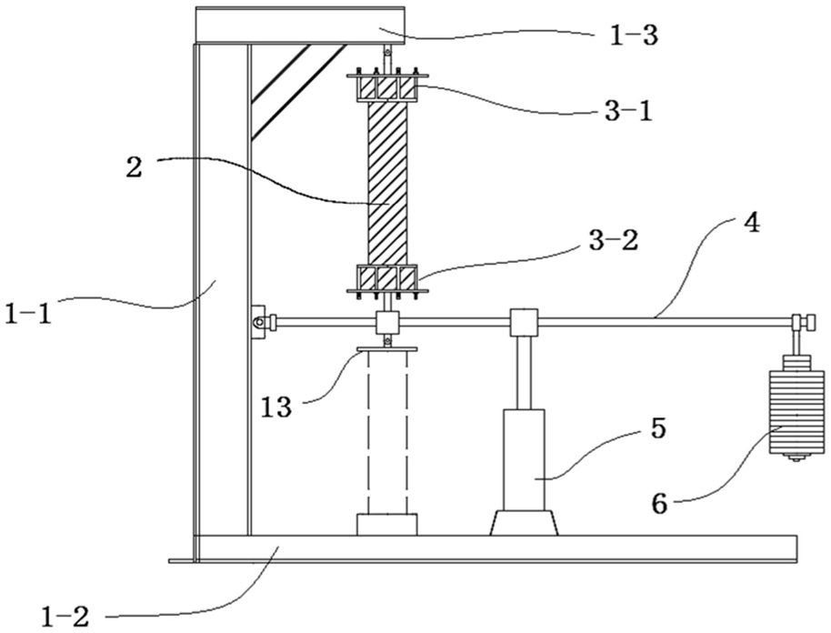 3)当进行受拉徐变试验时,将混凝土柱试件(2)两端的凸起部安装到固定托盘上,将上固定托盘(3-1)的顶部悬挂铰接在横杆(1-3)上;当进行受压徐变试验时,将混凝土柱试件(2)放置于底座(1-2),混凝土柱试件(2)的顶端放置传力板(13),调平并接触密实;