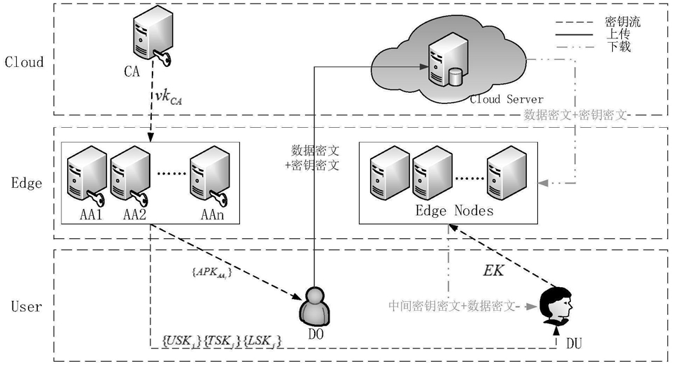 1.一种面向边缘计算的属性加密访问控制方法,其特征是,具体包括步骤如下:步骤1、初始化,包括:中央授权机构初始化建立整个系统;属性授权机构通过中央授权机构进行注册,负责管理系统中的所有属性,且每个属性授权机构管理的属性集合没有交集;数据所有者通过中央授权机构进行注册;数据用户通过中央授权机构进行注册,并由中央授权机构认证数据用户的身份和授权;