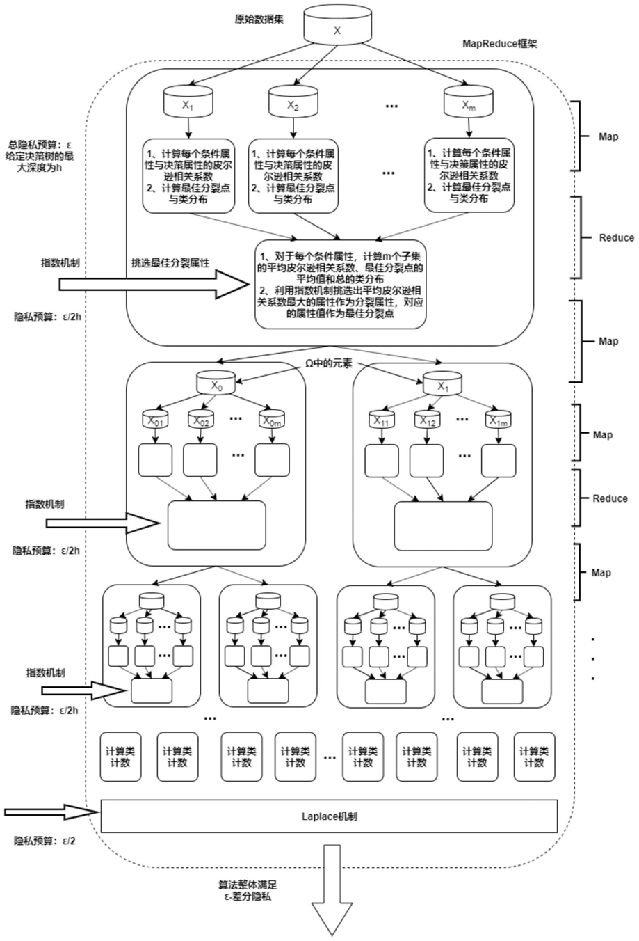 1.MapReduce框架下决策树的差分隐私保护方法,其特征是,包括步骤如下:步骤1、初始化:给定决策树最大深度h和不相交子集的个数m,令当前决策树深度j=0,令集合Ωj为原始数据集,并将原始数据集中的所有条件属性归入条件属性集;