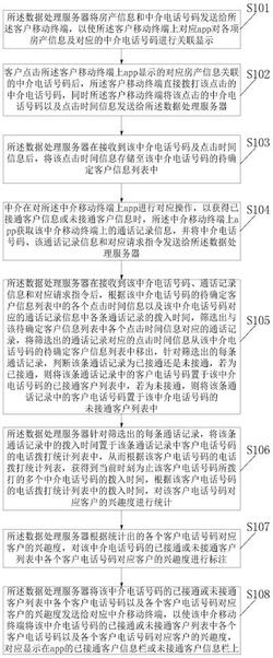 所述步骤S108还包括:所述数据处理服务器还将该中介电话号码的已接通或未接通客户列表中各个客户电话号码对应客户所感兴趣房产的特征信息发送给对应中介移动终端,以使该中介移动终端将该中介电话号码的已接通或未接通客户列表中各个客户电话号码对应客户所感兴趣房产的特征信息,对应显示在app的已接通客户信息栏或未接通客户信息栏上。