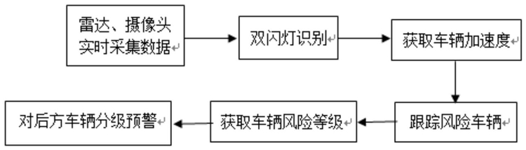 步骤6,跟踪双闪灯开启的车辆,获取双闪灯开启的车辆的加速度,并根据车辆加速度确定车辆状态风险等级,统计风险范围内的高风险等级车辆数量,并据此进行相应预警;