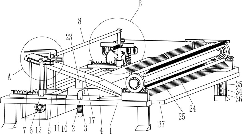 1.一种皮革钱包生产用的自动铲边装置,其特征是,包括有:支撑板;固定部件,设置于支撑板顶部中间,通过升降方式进行压紧;滑动铲皮部件,设置于支撑板顶部左侧,通过滑动方式进行铲皮;清洁部件,设置于支撑板顶部右侧,通过转动方式进行清洁;传动部件,设置于滑动铲皮部件上,通过滑动的方式进行间歇传动;固定部件包括有L形导杆、第一弹簧和压板,支撑板顶部中间前后两侧均滑动式设有L形导杆,L形导杆与支撑板之间连接有第一弹簧,L形导杆顶部之间设有压板;滑动铲皮部件包括有滑轨、第一滑块、第二弹簧、凹形架、第一导套、滑板、丝杆、螺母、第一全齿轮、导轨、滑轴、铲刀、L形杆、第二导套、减速电机、扇形齿轮和挡块,支撑板顶部左侧前后两方均设有滑轨,滑轨上均滑动式设有第一滑块,第一滑块与滑轨之间连接有第二弹簧,前后两侧第一滑块之间设有凹形架,凹形架前部滑动式设有两个第一导套,支撑板左部开有第一滑槽,第一滑槽内滑动式设有滑板,滑板底部设有螺母,支撑板底部左侧转动式设有丝杆,丝杆与螺母配合,丝杆后侧设有第一全齿轮,滑板顶部前后两侧均设有导轨,导轨内滑动式设有滑轴,滑轴之间设有铲刀,铲刀底部右侧设有挡块,挡块与压板配合,第一导套右侧设有第二导套,第二导套内滑动式设有L形杆,L形杆底部与铲刀连接,支撑板左部后侧开有一字孔,支撑板顶部后侧设有减速电机,减速电机输出轴上设有扇形齿轮,扇形齿轮与第一全齿轮啮合,扇形齿轮与一字孔在竖直方向有部分重合;清洁部件包括有刷子和转动轴,支撑板顶部右侧转动式设有转动轴,转动轴上均匀设有至少两个刷子;传动部件包括有导向杆、第一齿条和第三弹簧,凹形架后部滑动式设有导向杆,导向杆后侧设有第一齿条,导向杆与凹形架之间连接有第三弹簧;还包括有滑轮、拉线、第二滑块、第二齿条、第四弹簧和第二全齿轮,减速电机顶部设有滑轮,第一齿条后侧连接有拉线,支撑板顶部后侧设有第二滑块,第二滑块上滑动式设有第二齿条,第二齿条与第二滑块之间连接有第四弹簧,拉线绕过滑轮与第二齿条连接,转动轴后侧设有第二全齿轮,第二全齿轮与第二齿条啮合。2.如权利要求1所述的一种皮革钱包生产用的自动铲边装置,其特征是,还包括有第三滑块、第五弹簧和放置板,支撑板右侧下部前后对称开有第二滑槽,第二滑槽内滑动式设有第三滑块,第三滑块与第二滑槽之间连接有第五弹簧,前后两侧第三滑块之间设有放置板,放置板与支撑板配合。