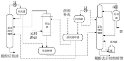 (3)萃取物分馏:将步骤(1)得到的萃取物和步骤(2)得到的塔顶产物送入萃取物槽,在槽内混合,然后送入萃取物分馏塔内进行分馏;萃取物分馏塔顶部采出的气相冷凝后流入结晶器;萃取物分馏塔侧线采出的气相冷凝后,部分回流,部分进入溶剂循环槽;萃取物分馏塔底部采出的酚类混合物,作为产品送出;