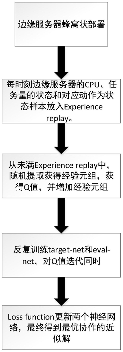最终利用经验元组对两个神经网络的训练,不断迭代Q值,使其在边缘服务器受限计算资源状态的情况下边缘服务器将会得到一个最优近似解的解,作为边缘服务器协同合作的最优策略。
