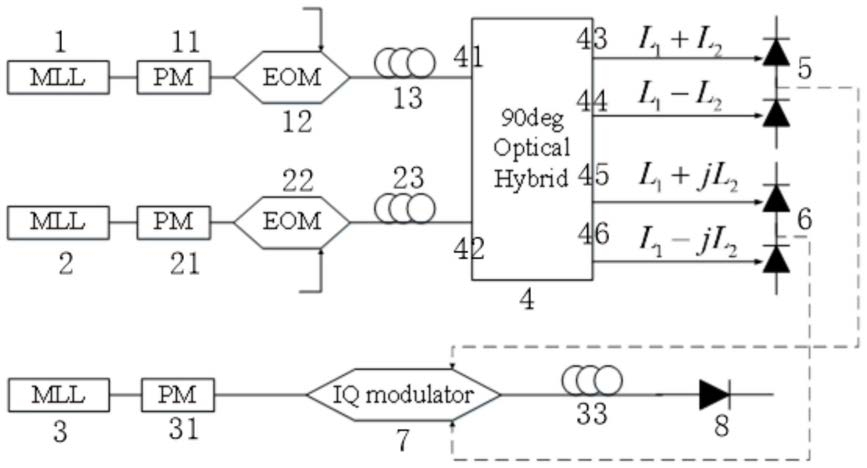 3.基于权利要求1-2任一项所述的基于塔尔伯特效应的光域互相关运算方法的基于塔尔伯特效应的光域互相关运算装置,其特征在于,包括第一锁模激光器、第二锁模激光器、第三锁模激光器、第一相位调制器、第二相位调制器、第三相位调制器、第一光电调制器、第二光电调制器、第一色散光纤、第二色散光纤、第三色散光纤、90度光学混合器、第一平衡光电探测器、第二平衡光电探测器、IQ调制器、光电探测器;其中:第一锁模激光器、第一相位调制器、第一光电调制器、第一色散光纤、90度光学混合器的第一输入端通过光纤顺次相连;第二锁模激光器、第二相位调制器、第二光电调制器、第二色散光纤、90度光学混合器的第二输入端通过光纤顺次相连;第三锁模激光器、第三相位调制器、IQ调制器输入端通过光纤顺次相连;90度光学混合器的第一输出端、第二输出端与第一平衡光电探测器相连,90度光学混合器的第三输出端、第四输出端与第二平衡光电探测器相连;IQ调制器与第一平衡光电探测器、第二平衡光电探测器通过同轴线相连;IQ调制器的输出端和第三色散光纤、第三光电探测器通过光纤相连。