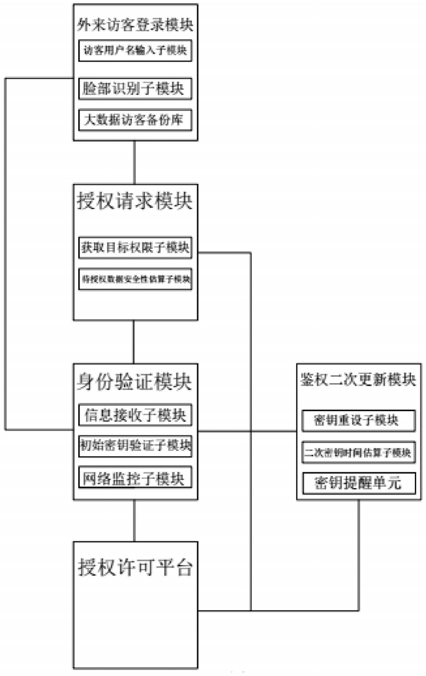 所述外来访客登录模块用于使外来访客信息进行登录,授权请求模块用于对外来访客进行请求外来访客的智能动态授权系统的授权许可,身份验证模块用于对外来访客身份进行验证,鉴权二次更新模块用于一段时间内对密钥进行二次更新,授权许可平台用于在外来访客身份验证后对该访客进行系统授权;外来访客登录模块包括访客用户名输入子模块、脸部识别子模块、大数据访客备份库,访客用户名输入子模块、脸部识别子模块与大数据访客备份库通过内网连接,访客用户名输入子模块用于使外来访客进行用户名的输入,脸部识别子模块用于对访客进行脸部识别,大数据访客备份库用于对注册访客的用户名和识别的脸部特征进行绑定存储,方便访客登录时进行调用验证;授权请求模块包括获取目标权限子模块和待授权数据安全性估算子模块,其中,获取目标权限子模块与大数据访客备份库通过内网连接,待授权数据安全性估算子模块与获取目标权限子模块通过内网连接,获取目标权限子模块用于将需要系统授权信息的服务标识号发送给授权许可平台,待授权数据安全性估算子模块用于对访客需要系统授权信息进行安全性级别估算,授权许可平台将系统内部数据安全性分为三类:普通型、机密性、绝密型,待授权数据安全性估算子模块判断其安全性级别;身份验证模块包括信息接收子模块、初始密钥验证子模块和网络监控子模块,其中,信息接收子模块分别和外来访客登录模块、授权请求模块通过内网连接,初始密钥验证子模块用于使访客输入初始密钥进行验证登录,网络监控子模块用于检测访客进行登录时网络环境是否安全,若待授权数据安全性估算子模块对访客需要系统授权信息安全性估算为普通型,则不启用网络监控子模块,授权许可平台直接进行授权,若待授权数据安全性估算子模块对访客需要系统授权信息安全性估算为机密型或绝密型,将信息发送给鉴权二次更新模块;鉴权二次更新模块包括密钥重设子模块、二次密钥时间估算子模块、密钥提醒单元,密钥重设子模块、二次密钥时间估算子模块分别和身份验证模块通过内网连接,密钥提醒单元分别和密钥重设子模块、二次密钥时间估算子模块通过内网连接,密钥重设子模块用于对密钥重新进行设置,其中设置的密钥由数字、符号和字母的任意组合所组成,二次密钥时间估算子模块用于根据用户身份验证的时间和安全系数进行分析后设定密钥的使用时间,密钥提醒单元用于通过短信的形式将二次密钥发送给访客注册存留的手机号上进行重新登录;密钥重设子模块内部存在多个节点,多个节点对应相应的数字、符号和字母,其中,数字、符号和字母在密钥系统中的占比分别为7:1:3,设置固定字母充当密钥内部的公钥,当接收到鉴权二次更新模块发送给更改密钥的命令,节点按照占比顺序重新对密钥进行排序,密钥重设子模块内部设有检测节点变化子模块,检测节点变化子模块对新更新的密钥进行检测,在公钥不变的情况下,控制密钥的更新,设定公钥为任意字母X,新更新的密钥在公钥临近位置设定为公钥前进一位字母X+1,当临近字母设置在公钥右,则记为-(X+1),当临近字母设置在公钥左,则记为+(X+1),密钥重设子模块控制-(X+