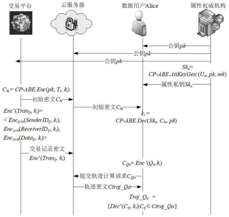 1.一种面向多模态区块链交易的客体追踪方法,其特征在于:依次包括以下步骤:(1)系统初始化:属性权威机构调用密文策略属性基加密CP-ABE方案中的初始化算法Setup来计算系统公钥pk和主密钥mk,即(pk,mk)=CP-ABE.Setup(1λ),