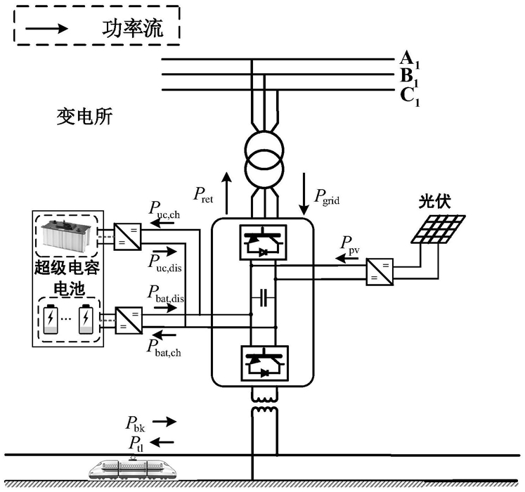 式中: 为由公共电网输入到柔性牵引供电系统的网侧变流器有功功率, 为由牵引供电系统网侧变流器反馈至公共电网的有功功率; 为电池的放电功率, 为电池的充电功率, 为超级电容的放电功率, 为超级电容的充电功率, 为光伏发电的有功输出; 为柔性牵引供电系统牵引侧变流器牵引负荷的有功功率, 为再生制动的有功功率;