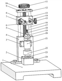 柱形导轨(16)数量为两根,柱形导轨(16)下端固接于支撑板(4)上,柱形导轨(16)上端通过紧定螺钉(9)与滑台限位板(12)固定,两根柱形导轨(16)平行布置;丝杠(5)两端安装两个丝杠轴承(10),丝杠(5)下端连接于支撑板(4),丝杠(5)上端连接于限位板(12),丝杠(5)与两根柱形导轨(16)平行布置。