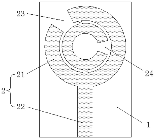 7.根据权利要求1所述的超宽带微带天线,其特征在于:所述辐射贴片(2)还包括馈电部(22),所述馈电部(22)与第一部分相连,且馈电部(22)的中轴线与基板(1)的中轴线位于同一直线上。