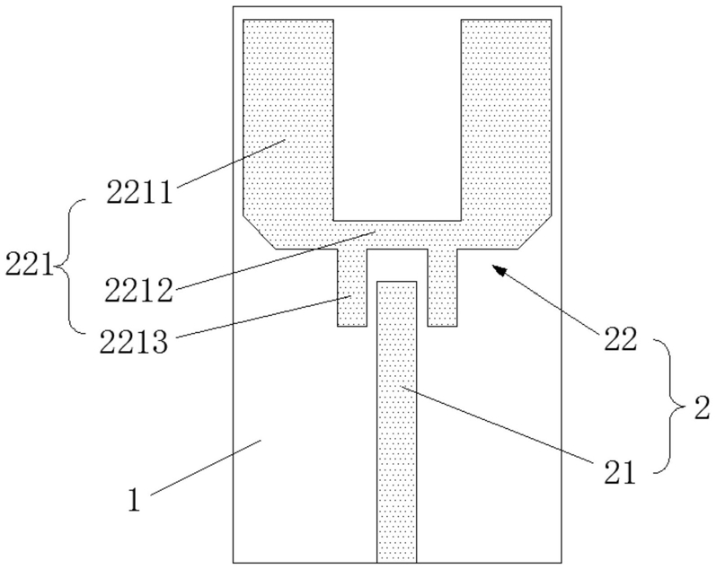 所述第一部分(221)包括第二子贴片(2212)、两个互相平行的第一子贴片(2211)和两个互相平行的第三子贴片(2213),所述两个第一子贴片(2211)和两个互相平行的第三子贴片(2213)分别设置于第二子贴片(2212)的两侧;