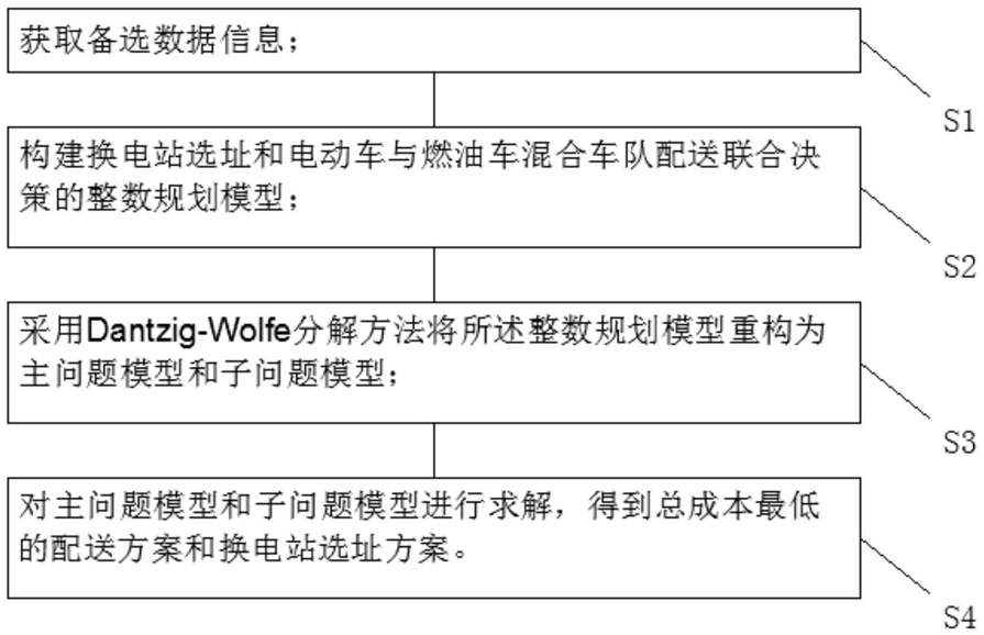 2.根据权利要求1所述的换电站选址与混合车队路径规划方法,其特征在于,所述备选数据信息包括:配送中心的数量和地址;电动车数量,电动车每公里配送成本,电动车的最大行驶里程;燃油车数量,燃油车每公里配送成本;每个等待配送客户的位置、需求和服务时间窗;每个备选换电站的位置。