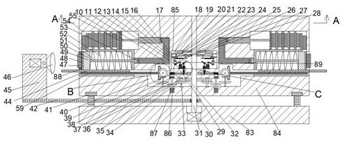 所述第十三皮带轮下方设有固定安装在所述第九轴上的第十四斜齿轮,所述第十四斜齿轮下方齿轮啮合连接设有第十五斜齿轮,所述第十五斜齿轮固定安装在第十轴上,所述第十轴后端转动安装在所述减速腔的后端壁内,所述第十五斜齿轮前端面设有固定安装在所述第十轴上的转动连接杆,所述转动连接杆下端固定安装转动安装设有第十一轴,所述转动连接杆前侧设有转动安装在所述第十一轴上的左衔接杆,所述左衔接杆右端转动安装设有第十二轴,所述左衔接杆前侧设有转动安装在所述第十二轴上的右衔接杆,所述右衔接杆下方设有固定安装在所述减速腔下端壁上的支撑固定块,所述支撑固定块前端面固定安装设有第十三轴,所述右衔接杆下端面转动安装在所述第十三轴上的,所述右衔接杆前侧设有固定安装在所述第十三轴上的右转动杆,所述右转动杆上滑动安装设有倾斜滑动块,所述倾斜滑动块前端面固定安装设有第十四轴,所述第十四轴上转动安装设有下衔接块,所述下衔接块滑动安装在所述支撑固定块内并延伸至所述滑动腔内固定安装在所述上导电块的上端面上。