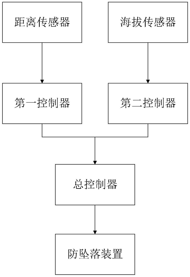 1.一种汽车防坠落系统,其特征在于,包括防坠落装置(1)、距离传感器、海拔传感器、第一控制器、第二控制器以及总控制器;