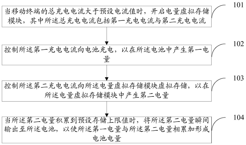1.一种充电控制方法,其特征在于,所述方法包括:当移动终端的总充电电流大于预设电流值时,开启电量虚拟存储模块,其中所述总充电电流包括第一充电电流与第二充电电流,所述电量虚拟存储模块为虚拟的模块;