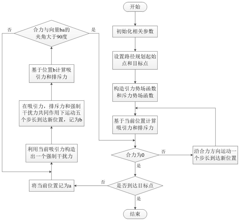 S5,利用步骤S3和S4中计算得到的吸引力和排斥力引导移动机器人向目标点前进,包括,若当前吸引力和当前排斥力的合力为0并且移动机器人当前位置就是目标点,则路径规划完成;