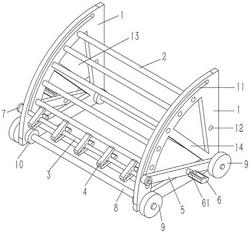 8.根据权利要求1所述的一种绗缝被搬运用周转车,其特征在于:所述侧支架板(1)上成型有扇形的减重槽孔(13),减重槽孔(13)内设有斜置的支撑筋杆(14),支撑筋杆(14)的两端成型在减重槽孔(13)两侧的侧支架板(1)上。