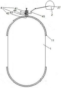 1.一种充气一步到位的正压式空气呼吸器,包括头套和空气瓶,所述空气瓶的上端设有阀门,所述头套内设有口罩,所述口罩设有贯通所述头套的进气口,其特征在于,所述阀门设有当空气瓶内的气压为设定值以上时开启的限压阀,所述阀门的出气口通过橡胶管同所述进气口连接在一起,所述头套设有套设在使用者的颈部上的颈部段,所述颈部段为柔性结构,所述颈部段设有颈部段收散机构,所述颈部段收散机构包括沿颈部段周向延伸的环形腔、绳索解开系紧机构和穿设在环形腔内的绳索,所述绳索解开系紧机构包括沿环形腔周向延伸的圆弧管,所述圆弧管的壁上设有沿圆弧管延伸方向延伸的拉索移动间隙,所述圆弧管内设有两个连接块、位于两个连接块之间的沿环形管延伸方向延伸的橡胶气杆和驱动两个连接块合拢的连接块合拢弹簧,所述绳索的两端交叉后一一对应地同所述两个连接块连接在一起,所述橡胶气杆连接有充放气口,所述头套内设有缓冲气囊,所述口罩内设有盖板合拢弹簧和吸气驱动式盖板开启机构,所述口罩内设有同所述缓冲气囊连通的氧气囊接口,所述氧气囊接口设有氧气囊接口盖板,所述盖板合拢弹簧用于驱动所述氧气囊接口盖板封闭住所述氧气囊接口,所述吸气驱动式盖板开启机构用于克服所述盖板合拢弹簧的弹力而使得所述氧气囊接口盖板开启,所述吸气驱动式盖板开启机构包括气缸、铰接在口罩内的撬杆和位于气缸内的平衡塞,所述撬杆的一端同所述氧气囊接口盖板连接在一起、另一端同所述平衡塞连接在一起,所述平衡塞驱动所述撬杆转动的力臂大于所述盖板合拢弹簧驱动所述撬杆转动的力臂,所述平衡塞将所述气缸分割为密封腔和同所述口罩连通的开口腔;初始状态时,所述开口腔的气压大于等于密封腔的气压且氧气囊接口盖板封闭住所述氧气囊接口;当吸气而导致开口腔内的压力下降时,密封腔和开口腔的压差驱动平衡塞朝向开口腔移动从而使得撬杆摆动而克服所述盖板合拢弹簧的弹力而使得所述氧气囊接口盖板开启;充气一步到位的正压式空气呼吸器还包括控制装置,所述颈部段收散机构有两个且沿上下方向分布,所述充放气口连接有充放气泵,所述控制装置控制所述两个颈部段收散机构的绳索按照设定的时间间隔交替系紧;所述充放气泵同所述缓冲气囊连接在一起。