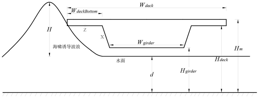 4.根据权利要求3所述的方法,其特征在于:垂直静水波浪力包括两种情况:当桥面板顶部波浪力等于零时,第一种情况发生,垂直静水波浪力来自没有水过顶时结构下方的水的体积;第二种情况则是桥面板和梁底部的波浪力减去波浪爬高造成的波浪力;波浪爬高Fw引起的垂直静水压力由爬高波浪的水体积表示;水平力FHC是由水平波浪力各分量共同作用而产生的,该计算与实际情况相符。