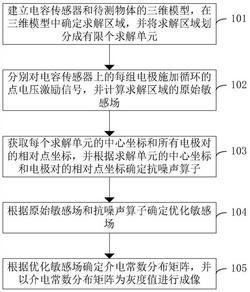 1.一种同面阵列电容传感器成像方法,其特征在于,包括:建立电容传感器和待测物体的三维模型,在所述三维模型中确定求解区域,并将所述求解区域划分成有限个求解单元;