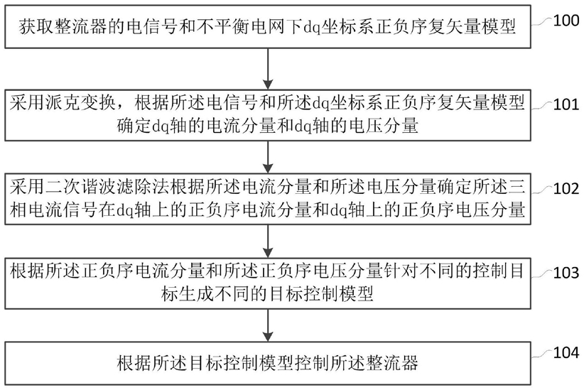 目标控制模型生成模块,用于根据所述正负序电流分量和所述正负序电压分量针对不同的控制目标生成不同的目标控制模型;所述控制目标包括:负序电流控制目标、有功功率二次谐波分量控制目标和无功功率二次谐波控制目标;所述目标控制模型包括:抑制整流器交流负序电流控制模型、抑制整流器有功功率二次谐波分量控制模型和抑制整流器无功功率二次谐波控制模型;