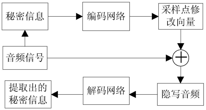 步骤11、将需要发送的秘密信息转换成二进制比特流,并将其构建成m*k的秘密信息y″,并在测试集中任意选取k个音频段,将其构建成m*k的测试样本x″;最后,将测试样本x″和秘密信息y″按照步骤2~步骤4中的处理后,则输入到训练完成的编码网络中,并根据步骤6中的计算后得到隐写音频s″,k为正整数;