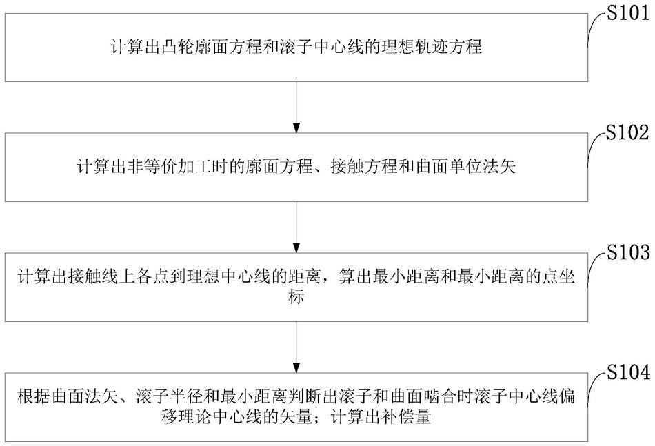 根据曲面法矢、接触角、滚子半径和最小距离判断出滚子和曲面啮合时滚子中心线偏移理论中心线的矢量;计算出补偿量。