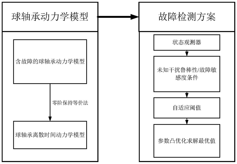2.根据权利要求1所述的一种球轴承故障检测方法,其特征在于,所述的步骤2.1具体表述为:步骤2.1.1:求解残差r(k)的鲁棒性l1,令公式(13)中的f(k)=0得到公式(14),求解公式(14)得到残差r(k)的鲁棒性l1的具体表达式,如公式(15)所示,式中,当无故障信号输入时,ed(k)=e(k),d(k)∈l∞,l∞表示l无穷空间范数,α表示待优化求解的未知正标量;
