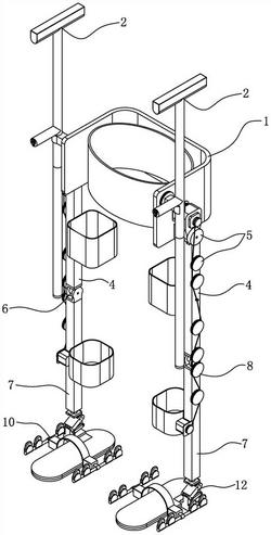 4)上,支撑杆(2‑1)的竖杆卡接在卡扣(1‑5)上,髋关节球型卡槽(3‑3)固装在U型挡板(1‑1)的两侧壁外壁面上,内座(5‑2‑1)固装在U型挡板(1‑1)的两侧壁外壁面上,加速度传感器(11‑1)安装在U型挡板(1‑1)的横板外侧面上。