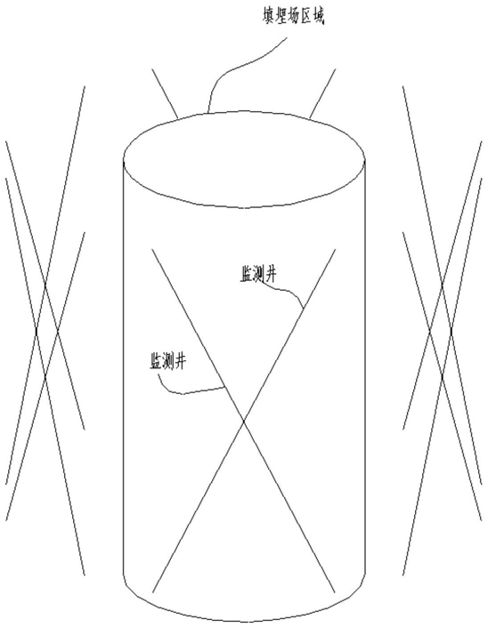 1.一种填埋场防渗系统跟踪监测井,其特征在于:所述填埋场防渗系统跟踪监测井在填埋场外圆周均布若干组,每组监测井中包括两个X形交错的监测井,监测井井孔内沿轴线方向设置若干个渗漏传感器(7),若干组所述监测井对于填埋场圆周方向的包角总和大于