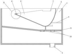 1.一种货车用外置防盗油箱,包括外壳(1),其特征在于:所述外壳(1)的顶部固定安装有进油口(2),所述外壳(1)的底部固定安装有出油口(3),所述外壳(1)一端靠近两侧的位置上活动套接有卸油装置(4),所述外壳(1)的内腔固定安装有隔仓底板(5),所述隔仓底板(5)的表面开设有通孔且该通孔内部活动套接有卸油装置(4),所述隔仓底板(5)的两侧与外壳(1)内腔的两侧相连,所述隔仓底板(5)顶部的两侧固定安装有竖隔仓板(6),所述竖隔仓板(6)的顶部开设有通油槽(7),所述隔仓底板(5)的一端且位于竖隔仓板(6)之间的位置上固定安装有止管块(8)。2.根据权利要求1所述的一种货车用外置防盗油箱,其特征在于:所述外壳(1)内腔且位于隔仓底板(5)底部的位置上固定安装有下隔板(9),所述下隔板(9)底部的两侧均固定套接有限压阀(10)。3.根据权利要求1所述的一种货车用外置防盗油箱,其特征在于:所述卸油装置(4)包括封油板(41),所述封油板(41)活动套接在隔仓底板(5)表面的通孔内,所述封油板(41)的底部活动套接有滑槽(42),所述滑槽(42)的一端固定安装在隔仓底板(5)表面通孔的底部,所述封油板(41)的一侧固定安装有拉杆(43),所述拉杆(43)与外壳(1)活动套接,所述拉杆(43)的一端固定安装有转轴(44),所述转轴(44)的外侧套设有把手(45),所述把手(45)可以转轴(44)的轴线旋转至外壳(1)中。4.根据权利要求1所述的一种货车用外置防盗油箱,其特征在于:所述隔仓底板(5)的截面由三个曲线C1、C2、C3构成,所述C1的半径为80cm,所述C2的半径为40cm,所述C3为一条直线,所述C1与C2内切,所述C3与C2相切。5.根据权利要求4所述的一种货车用外置防盗油箱,其特征在于:所述C1与止管块(8)端面之间的夹角为90度。6.根据权利要求4所述的一种货车用外置防盗油箱,其特征在于:所述进油口(2)的安装位置位于隔仓底板(5)中C1段的上方。7.根据权利要求1所述的一种货车用外置防盗油箱,其特征在于:所述隔仓底板(5)的右侧一端的高度高于左侧一端的高度。