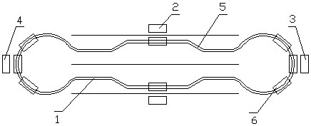 1.一种智轨无线无人驾驶公交电车系统,包括智能轨道、混凝土槽、左平面轨道、右平面轨道、轨道槽、位置霍尔传感器、轨道智能控制器、左、右电动牵引机、柔性传动带、传动夹板、联动器、车底盘、车厢、轮毂发电机、蓄电池、车载计算机控制器、电动方向机、电动前门、电动后门、投币箱、刷卡机、语音播放器、纠偏霍尔元件、室内视觉传感器、室外视觉传感器和室外激光雷达,其特征在于:所述智轨无线无人驾驶公交电车系统设置智能轨道(1),智能轨道具有长距离电动牵引的功能和自动导航的功能,智能轨道设置在城市道路交通网的内环线、外环线或者直通专线的路面上,智能轨道围绕城市交通的环线或者直通专线的环线建成封闭的循环轨道,智能轨道在城市道路的路边设有多个公交站台(2),智能轨道设有终点站台(3)和始发站台(4),智能轨道设有多个弯道(5)进行变道靠近多个公交站台,根据客流量的多少,智能轨道的终点站和始发站设定多个公交电车(6),多个公交电车前、后排队集中在终点站和始发站,智能轨道下端设有混凝土槽(7),混凝土槽埋设在地下整体浇灌成型,混凝土槽的横截面图形为U形,混凝土槽沿着公交路线的轨迹建造,直行道路上建造直线型混凝土槽,转弯道路上建造曲线型混凝土槽,围绕公交路线建成封闭循环的混凝土槽,混凝土槽底部是下水道(8),下水道设有潜水泵(9),下水道底部的积水经过潜水泵和排水管(10)排到地面(11);智能轨道设有多个平面轨道,平面轨道的横截面为T形,平面轨道下端中部设有直板,平面轨道与直板长度相等,二者用金属材料制一体化制造成型,每根平面轨道的长度均为10米,平面轨道分别设有左平面轨道(12)和右平面轨道(13),左平面轨道安装在混凝土槽左上端,左平面轨道的左上端设有多个左沉头螺丝钉(14),多个左沉头螺丝钉将左平面轨道的上端固定在混凝土槽的左上端,左平面轨道的下端设有左直板(15),左直板下端设有多个左下螺丝钉(16),多个左下螺丝钉将左平面轨道的下端固定在混凝土槽的左下端,右平面轨道安装在混凝土槽右上端,右平面轨道的右上端设有多个右沉头螺丝钉(17),多个右沉头螺丝钉将右平面轨道的上端固定在混凝土槽的右上端,右平面轨道的下端设有右直板(18),右直板下端设有多个右下螺丝钉(19),多个右下螺丝钉将右平面轨道的下端固定在混凝土槽的右下端,左、右平面轨道上端的平面与道路平面一致,左、右平面轨道互相平行,左、右平面轨道之间设有平行的轨道槽(20),轨道槽的宽度为2厘米,左、右平面轨道对称于轨道槽的左、右端,左、右平面轨道设有直线型左、右平面轨道和曲线型左、右平面轨道,直线型混凝土槽上端安装直线型左、右平面轨道,曲线型混凝土槽上端安装曲线型左、右平面轨道,右平面轨道中部右端的路面埋设轨道智能控制器(21),轨道智能控制器的上端平面与路面一致,轨道智能控制器内设有电源开关控制模块、控制信号无线接收模块、无刷电机控制模块和操作程序控制模块,沿着智能轨道的右侧埋设地下电源电缆(22),电源电缆输送1000V的直流电源,电源电缆的分支电源线(23)连接轨道智能控制器的电源端,智能轨道设有多个左电动牵引机(24)和多个右电动牵引机(25),混凝土槽的两边设有多个左方形腔(26)和多个右方形腔(27),左方形腔与右方形腔对应,左平面轨道中部设有左窗口(28),左窗口与左方形腔对应,左电动牵引机位于左方形腔内中部,右平面轨道中部设有右窗口(29),右窗口与右方形腔对应,右电动牵引机位于右方形腔内中部,左、右电动牵引机的结构形式相同,对称于轨道槽的左、右端,多个左、右方形腔的前、后端相邻之间的中线距离均为10米,由轨道智能控制器、左、右平面轨道和左、右电动牵引机组成一个独立的小单元牵引轨道,智能轨道设有多个小单元牵引轨道,多个小单元牵引轨道的前、后端相互连接,贯通整个智能轨道,形成大单元牵引轨道,下面以右电动牵引机为例说明小单元牵引轨道,右平面轨道的右窗口对应的右方形腔内设有电机架,电机架的后视图形为U形,电机架右端设有底板(30),底板4角均设有连接螺丝钉(31),右方形腔右端4角均设有连接孔,4个连接螺丝钉经过连接孔将电机架底板定位在右方形腔中部,4个右螺丝帽(32)将底板紧固,底板左端设有上机架(33)和下机架(34),上、下机架的左端设有上轴孔和下轴孔,上、下轴孔内设有电机轴(35),电机轴是一种台阶轴,电机轴两端设有上螺丝帽(36)和下螺丝帽(37),上螺丝帽和上台阶挡(38)之间紧固上机架,下螺丝帽和下台阶挡(39)之间紧固下机架,电机轴上设有上轴承挡,上轴承挡上端设有上轴承(40),上轴承外圆设有上端盖(41),上端盖外圆设有导磁筒(42),导磁筒下端外圆设有连接圈(43),上端盖、导磁筒和连接圈一体化制造成型,电机轴下设有下轴承挡,下轴承挡下端设有下轴承(44),下轴承外圆设有下端盖(45),下端盖外圆设有挡圈(46),连接圈与挡圈吻合,连接圈与挡圈用多个螺丝钉(47)紧固,导磁筒外圆紧配合安装橡胶轮(48),导磁筒内圆设有永磁圈(49),永磁圈由8块大小相等的弧形永磁体排列组成,弧形永磁体的极性是径向的,相邻的弧形永磁体的极性互为相反,弧形永磁体用钕铁硼稀土材料制造,上端盖、下端盖、导磁筒和永磁圈组成永磁电机的外转子,电机轴中部设有定子铁芯(50),定子铁芯由多片硅钢片冲片叠加组成,定子铁