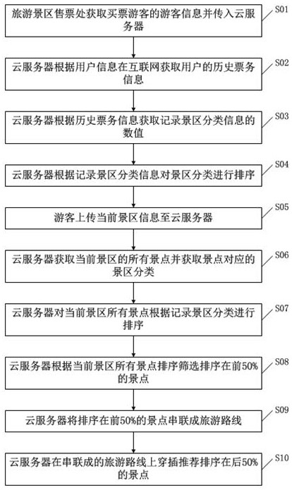 1.一种基于电子票务的云计算路线规划系统的工作方法,用于对游客在景区的路线进行规划,其特征在于,包括以下步骤:S01:旅游景区售票处获取买票游客的游客信息并传入云服务器;