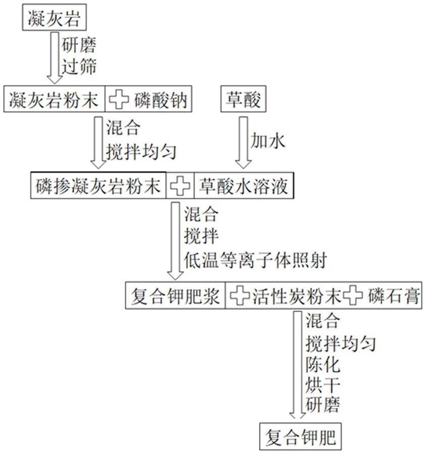 3)分别称量取草酸水溶液和磷掺凝灰岩粉末,混合搅拌,同时进行低温等离子体照射,得复合钾肥浆;
