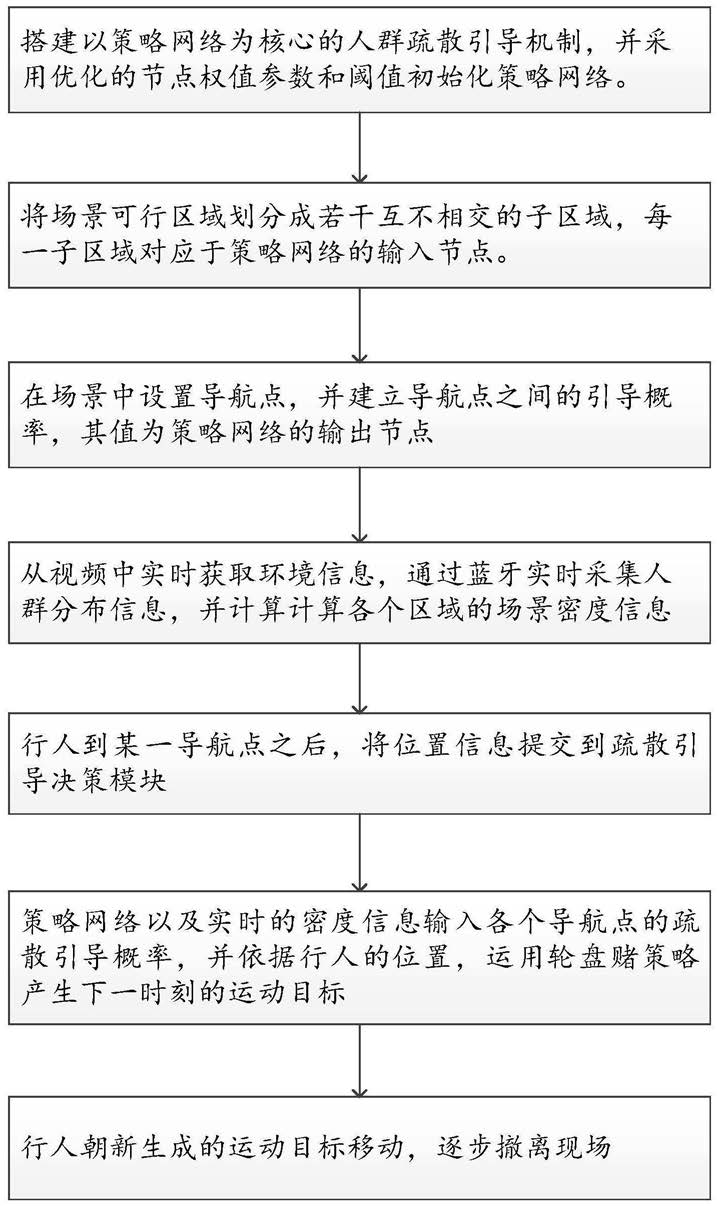 基于训练好的网络模型进行人群疏散仿真,在疏散过程中实时获取人群分布密度,并通过训练好的模型获得导航点之间的引导概率;