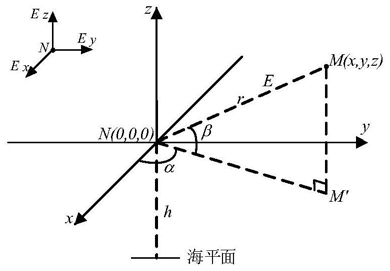由N1测得的雷暴云点电荷M1的坐标为M1(x1,y1,z1),M1在X‑Y平面上的投影为M1'(x1,y1,0),M1到N1的X轴、Y轴、Z轴的距离分别为x1、y1、z1;主大气电场仪本身高度与其所处海拔之和为h1;N1测得的雷暴云点电荷的水平偏角和仰角分别表示为α1和β1;N1测得的M1到N1的距离为r1,由N1测得的雷暴云点电荷的电场强度为E1;