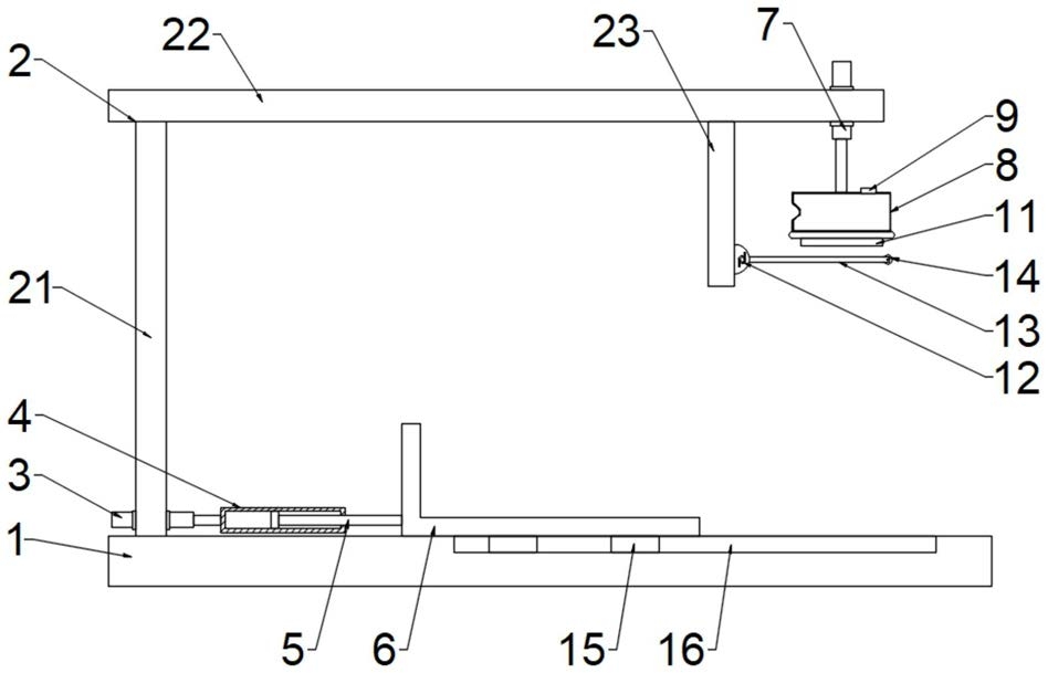 9.根据权利要求8所述的财务报表整合设备,其特征在于,所述支架(2)包括立柱(21),立柱(21)顶部固定连接有上横杆(22),上横杆(22)右侧固定连接有垂直立杆(23),水平杆(13)左端与垂直立杆(23)转动连接,第二伸缩驱动机构(7)固定于上横杆(22)右端。