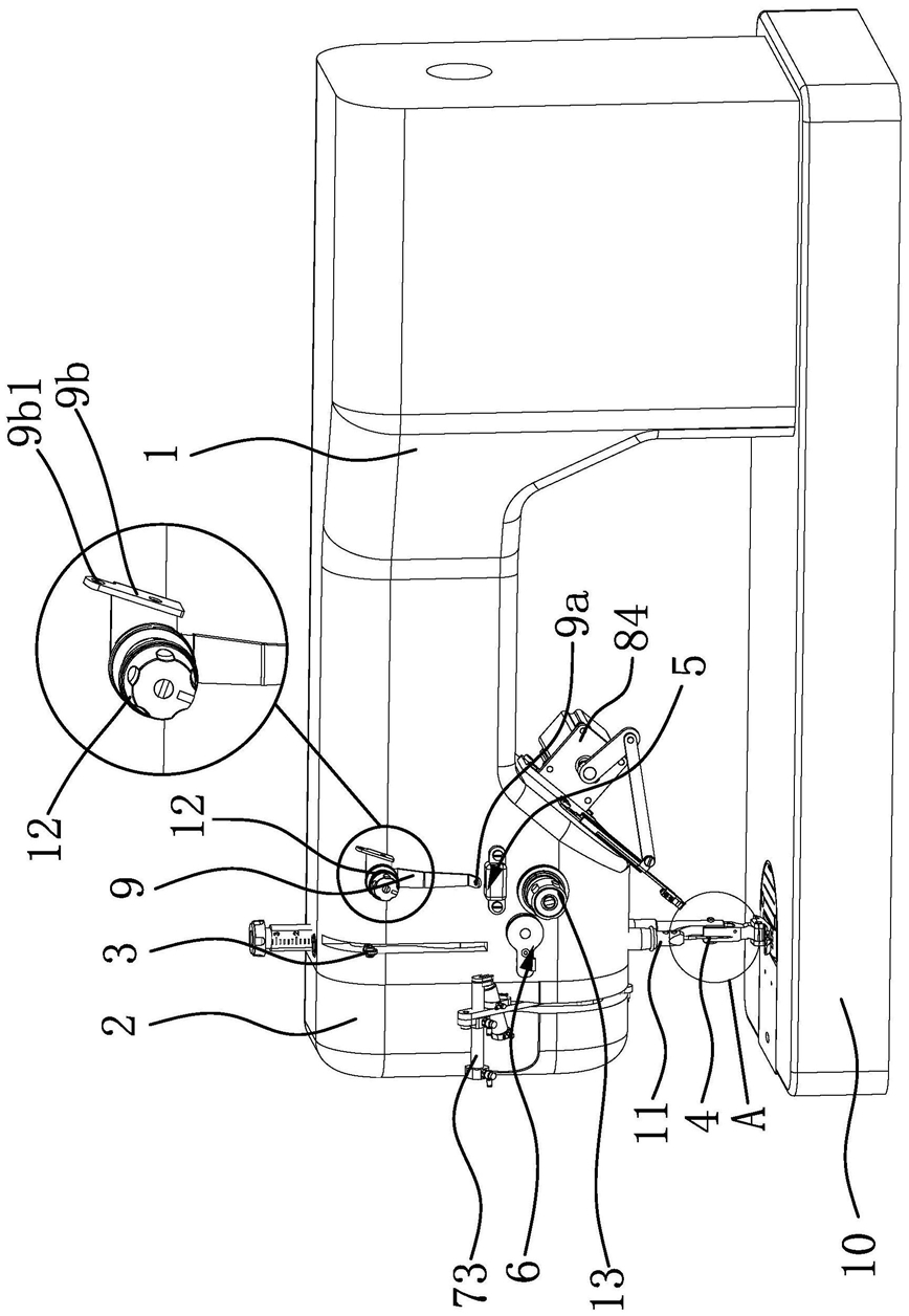 1.一种工业缝纫机自动穿线装置中的导向穿线结构,工业缝纫机包括机壳(1)、固设在所述机壳(1)一端的侧盖(2)、挑线杆(3)和机针(4),所述机针(4)上具有穿线孔(41),其特征在于,所述导向穿线结构包括铰接在所述侧盖(2)内侧且能够摆动的转动连杆(71)、能够驱动所述转动连杆(71)摆动至所述机针(4)的穿线孔(41)一侧的驱动件(72)、固设在所述机壳(1)下侧的导向板(85)以及滑动设置在所述导向板(85)上的穿线连杆(81);所述转动连杆(71)的一端固设有夹线气缸(73)和顶线气缸(74),所述夹线气缸(73)的输出轴外端上固设有夹线板(75),所述夹线板(75)上具有开口槽(75a),所述顶线气缸(74)的输出轴上固设有朝向所述开口槽(75a)的顶杆(76);所述转动连杆(71)和导向板(85)分别设置在所述机针(4)的两侧,所述导向板(85)的一端与所述机壳(1)固连,另一端倾斜向下正对处于上升状态的所述机针(4);所述穿线连杆(81)朝向所述机针(4)的一端固设有能够变形的穿线勾(82),所述穿线勾(82)采用具有韧性的钢丝制成且穿线勾(82)呈菱形;所述机壳(1)上还设有能够驱动所述穿线连杆(81)在所述导向板(85)上沿其长度方向往复移动的穿线电机(83);所述穿线电机(83)能够带动所述穿线勾(82)穿过所述机针(4)的穿线孔(41)且使所述穿线勾(82)位于所述机针(4)靠近所述顶线气缸(74)的一侧。