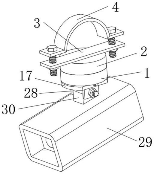 4.如权利要求1所述的一种易调节的监控用摄像头基座,其特征在于:所述安装板(17)的下表面通过一体铸造成型有固定结构(28),所述固定结构(28)为对称设置的一组矩形块,且其上开设有螺栓孔,且安装板(17)的下方设置有摄像头外壳(29),所述摄像头外壳(29)的上端设置有安装块(30),且摄像头外壳(29)通过安装块(30)固定安装在安装板(17)下端的固定结构(28)上。