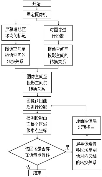 步骤4)求得的坐标转换模型对原图像进行贝塞尔曲面预扭曲,消除投影画面的整体几何畸变,完成几何校正。