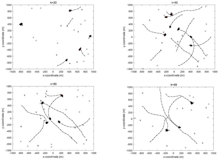 1.具有类型概率的L‑RFS混合目标结构建模与估计方法,其特征在于,该方法具体包括以下步骤:步骤(1).设定多目标在k时刻的混合状态集合Xk:多目标在k时刻的混合状态Xk用随机有限集集合表示:Xk={(xk,1),(xk,2),…,(xk,N(k))}∈F(χ);F(χ)表示状态空间χ的有限集的集合;N(k)为k时刻目标的个数,xk,i表示第i个多目标状态,每个值在状态空间χ上,i=1,2,…,N(k);