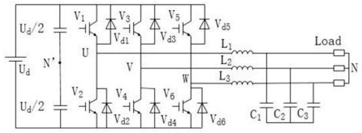 A11. 输出侧为三相LC滤波器,三相逆变器第一桥臂输出相U串联第一电感L1,第二桥臂输出相V串联第二电感L2,第三桥臂输出相W串联第三电感L3,L1、L2、L3输出端分别连接电容C1、C2、C3三个电容并连接至负载,C1、C2、C3三个电容的另一端子连接在一起;
