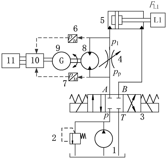 2.根据权利要求1所述的一种基于液压马达‑发电机压力补偿器的三通调速阀,其特征在于:还包括有液压泵(1)、溢流阀(2)、换向阀(3)、执行器(5)、蓄电池(11);